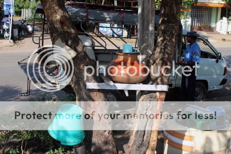 На обочине стоит традиционный для Мьянмы кувшин с питьевой водой.