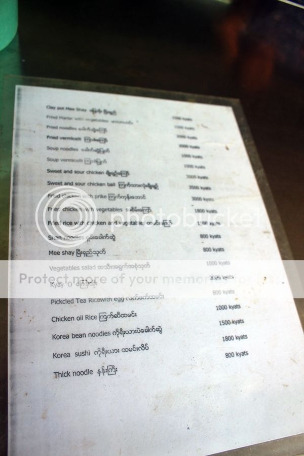 Где-то здесь я зашел пообедать в местную чифаньку. Она была прямо рядом с парадным входом, поэтому даже имелось меню на английском. Как видно, цены очень низкие - ничего дороже 2000 кьят ($1.5) нет в принципе.