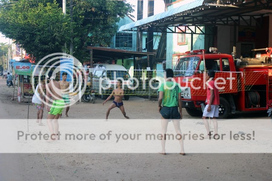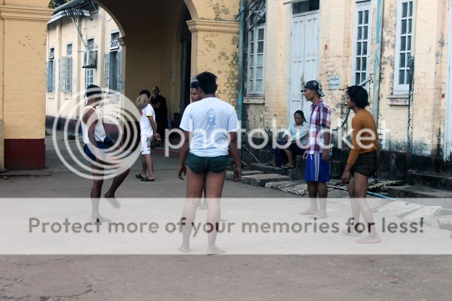 Парни играют в игру, похожую на волейбол ногами. Она распространена по всей Юго-Восточной Азии.