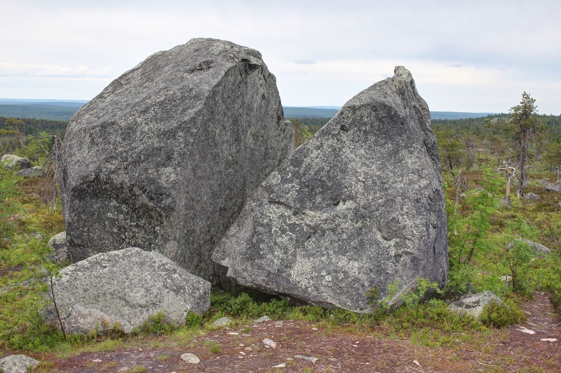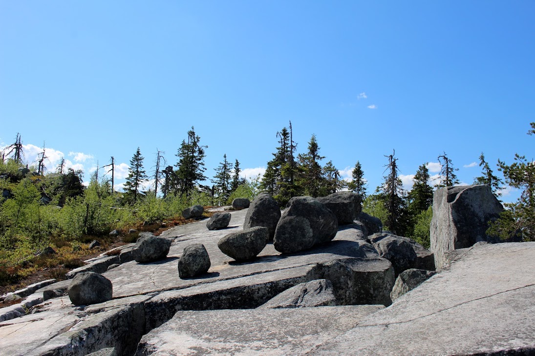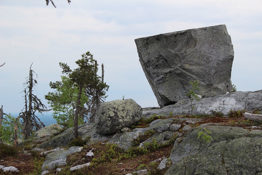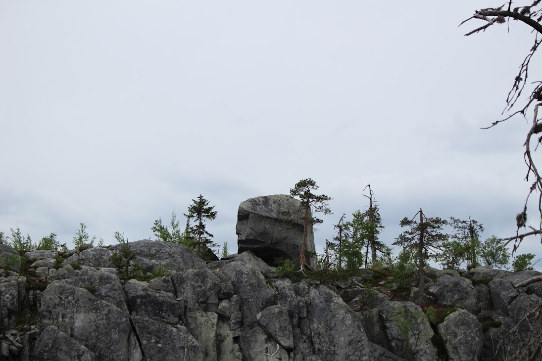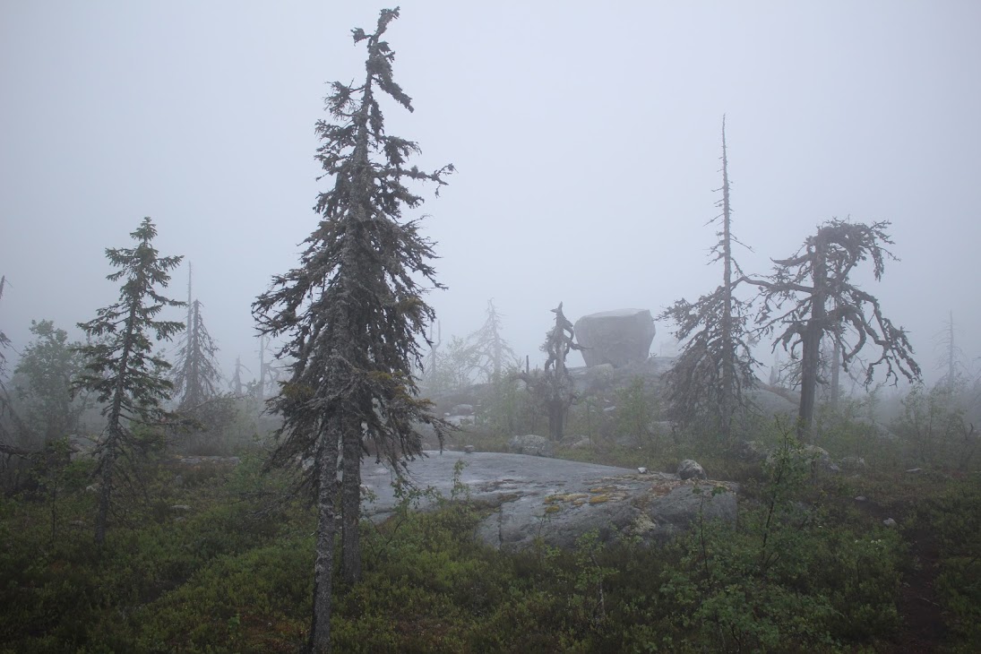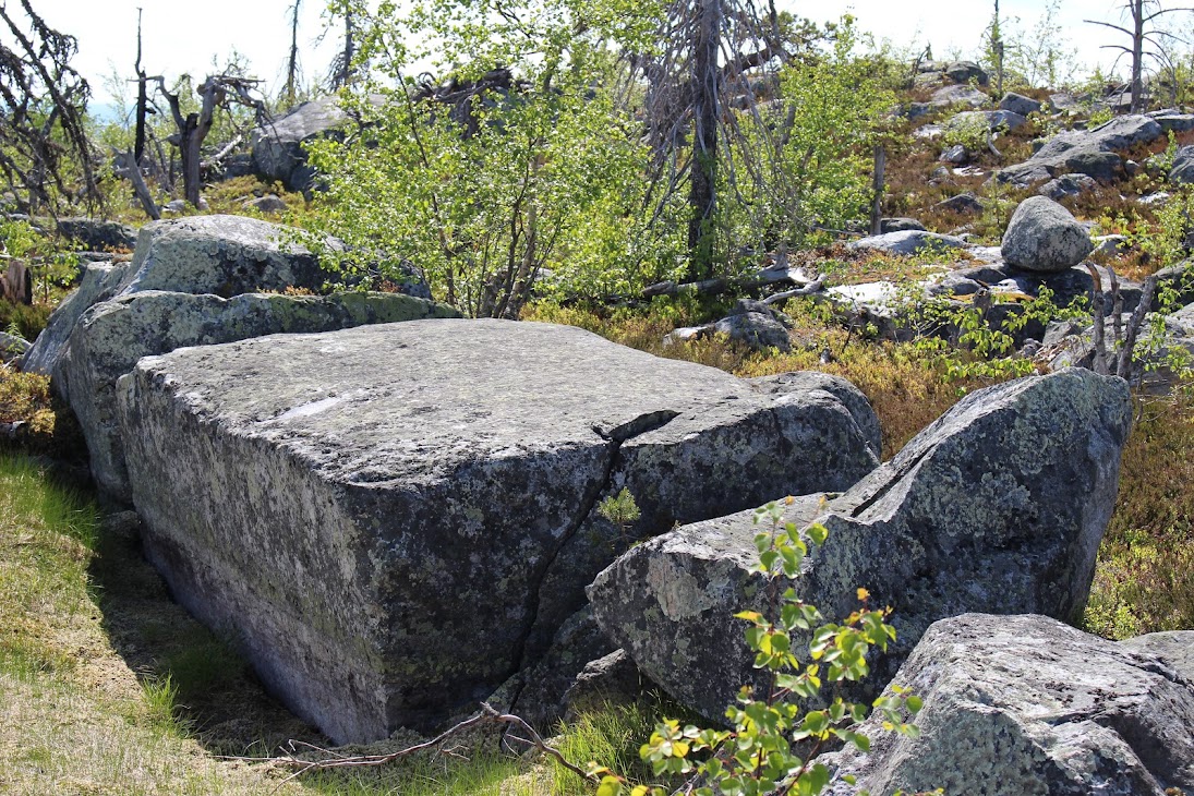 4) Плато сейдов. Достаточно ровный участок, много камней, несколько огромных валунов-сейдов. Деревья здоровые, но совсем невысокие, преобладает лесотундровая растительность. Очень похоже на вершины сопок Кольского.