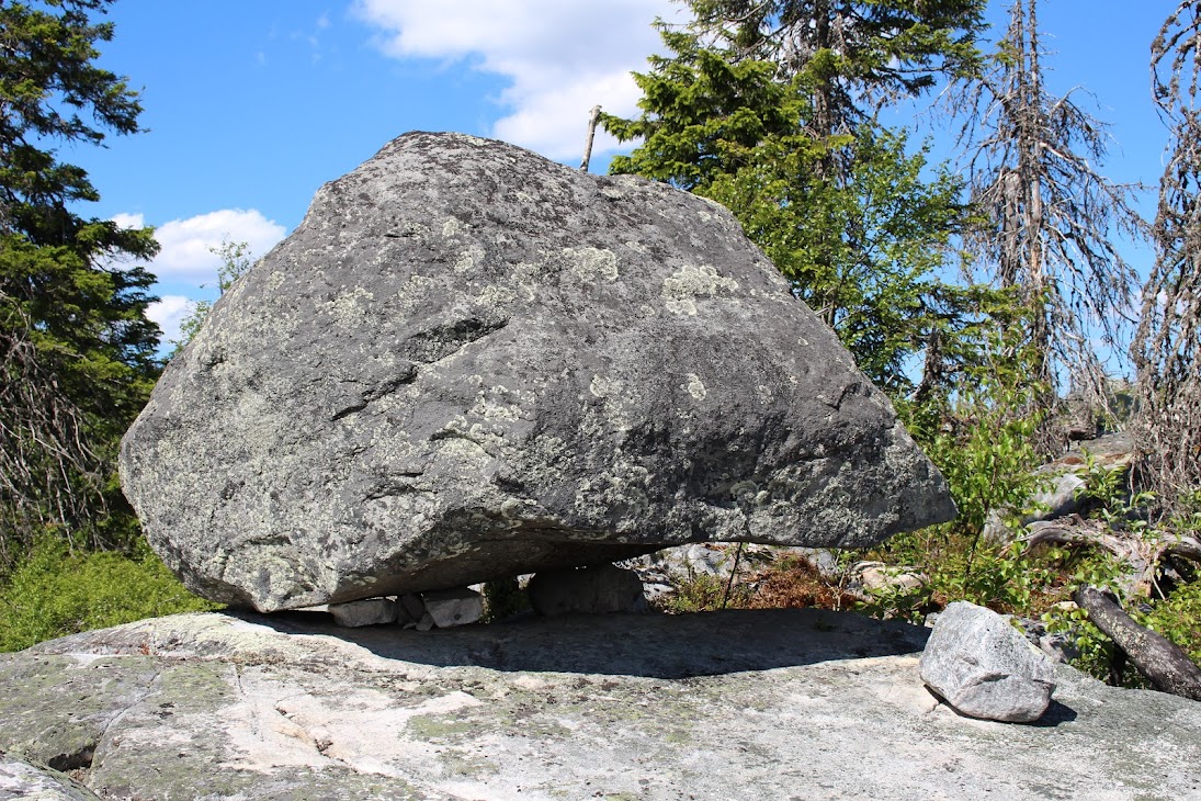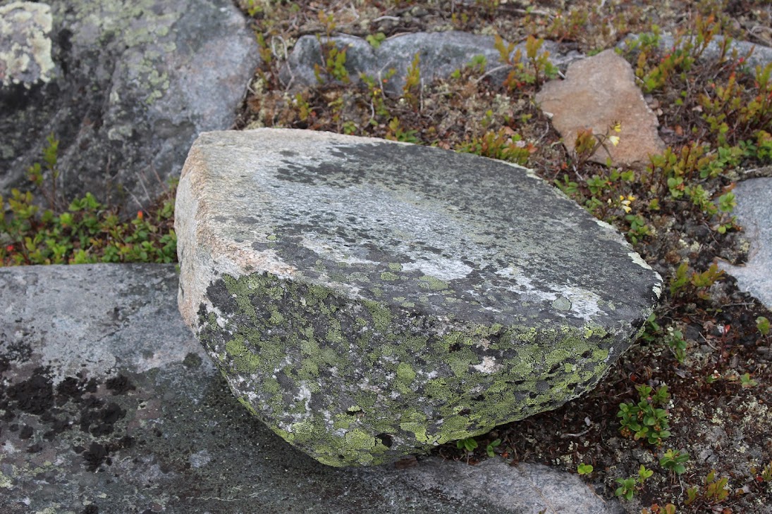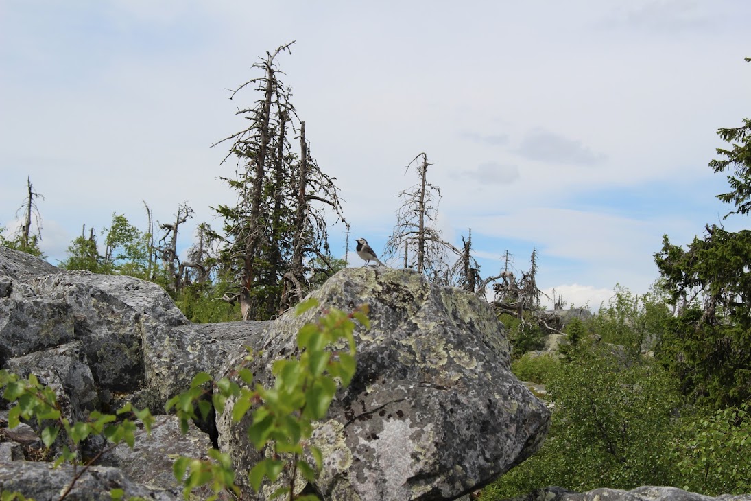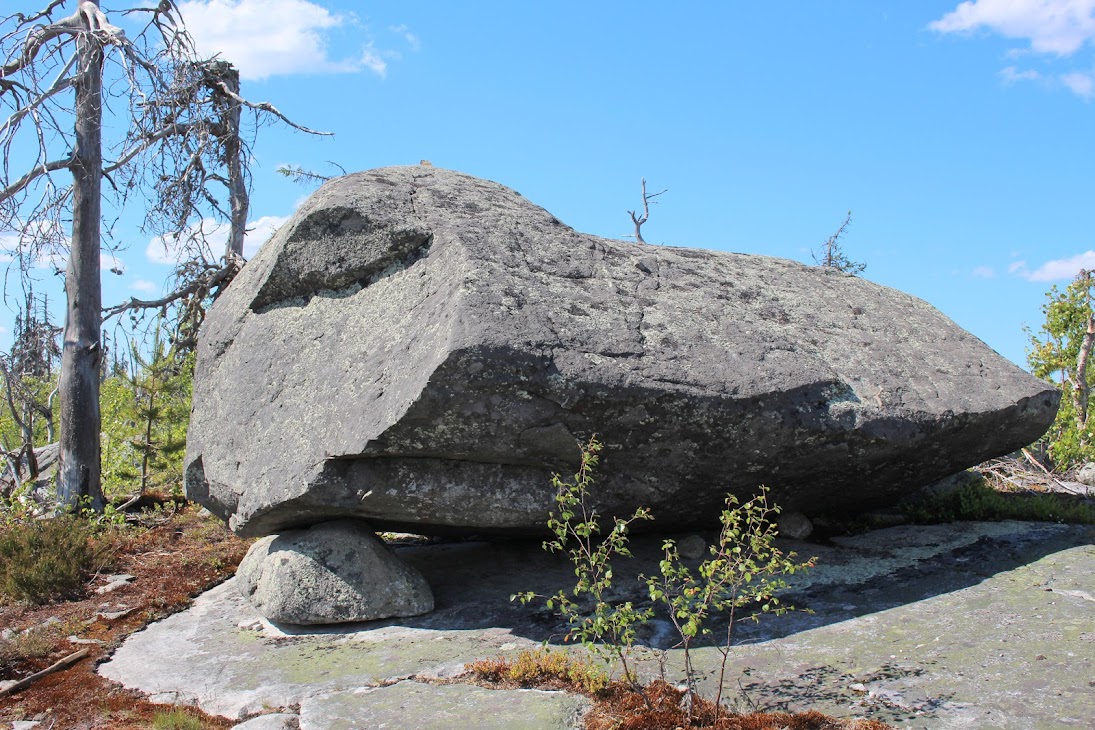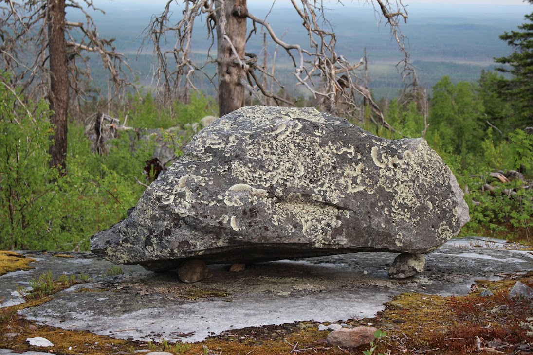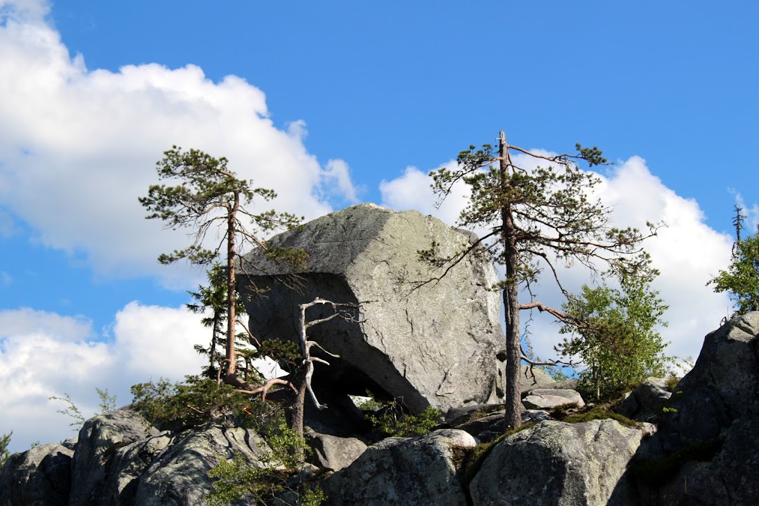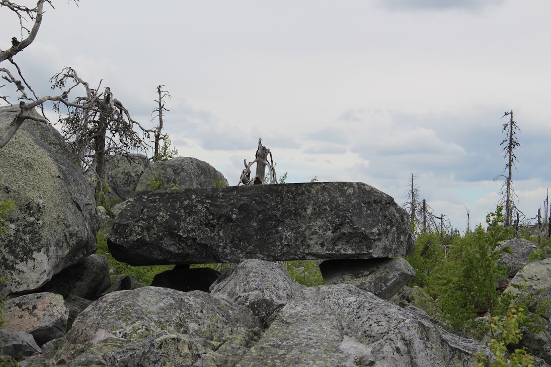 4) Плато сейдов. Достаточно ровный участок, много камней, несколько огромных валунов-сейдов. Деревья здоровые, но совсем невысокие, преобладает лесотундровая растительность. Очень похоже на вершины сопок Кольского.