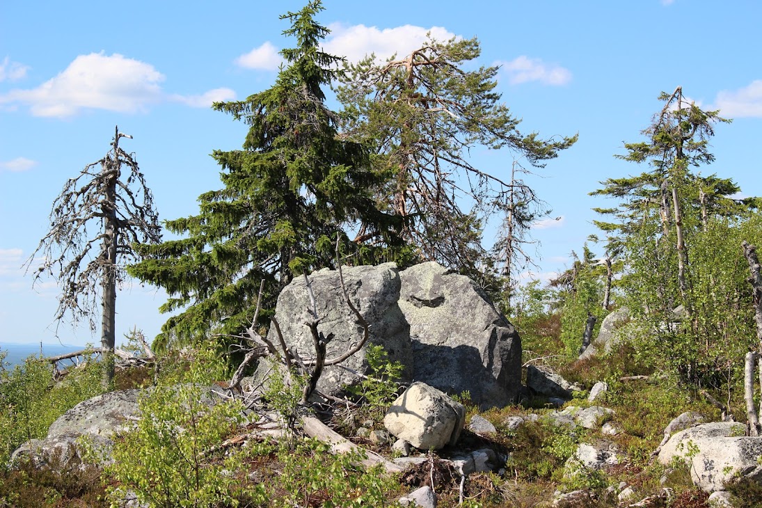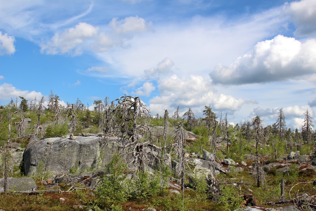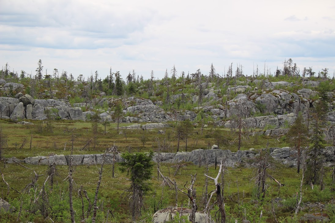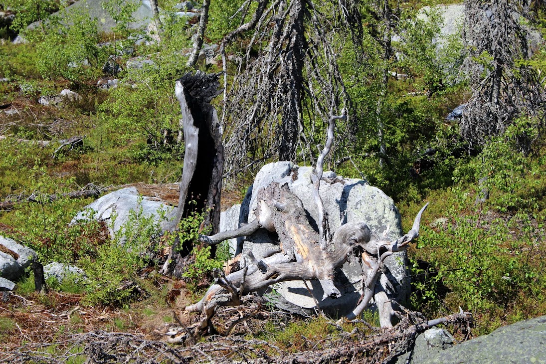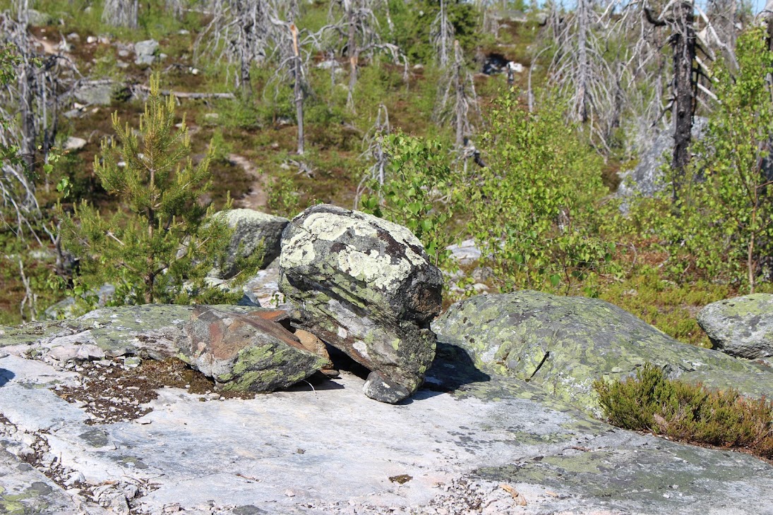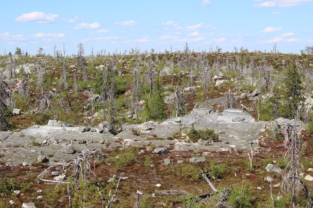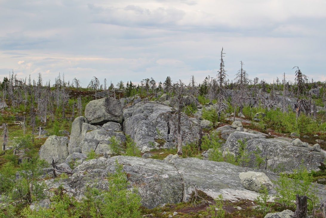 1) От юго-западного склона до озера. Здоровый лес на склоне переходит в сухие деревья. Много перекрученных деревьев. Много больших камней, много сейдов. Много бараньих лбов, обнажившихся скальных пород
