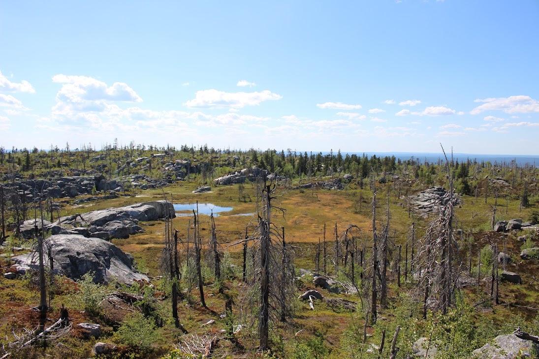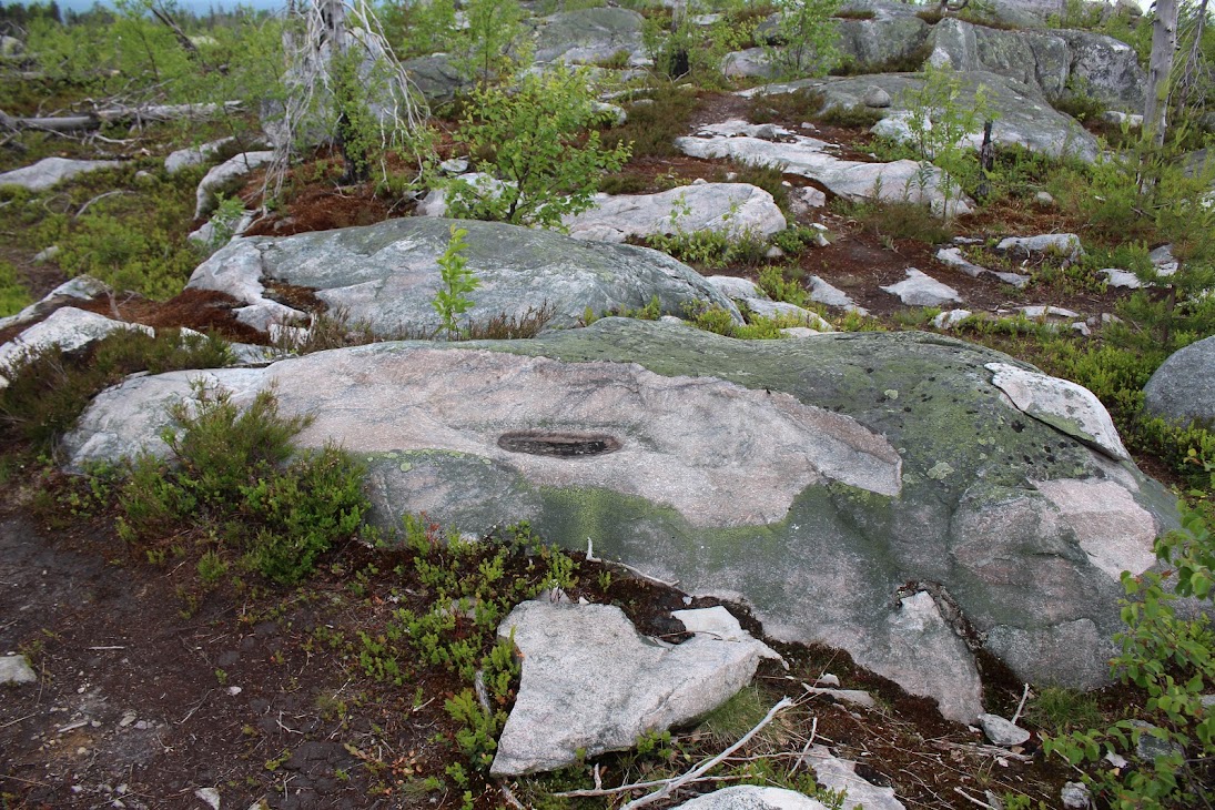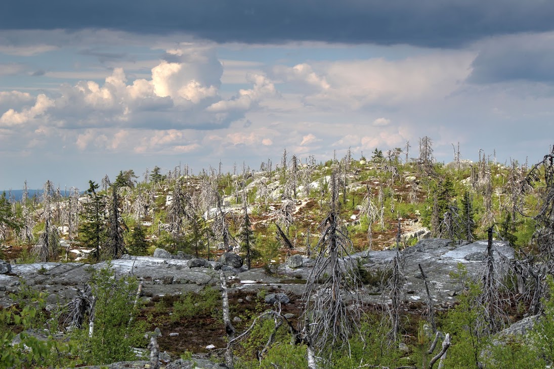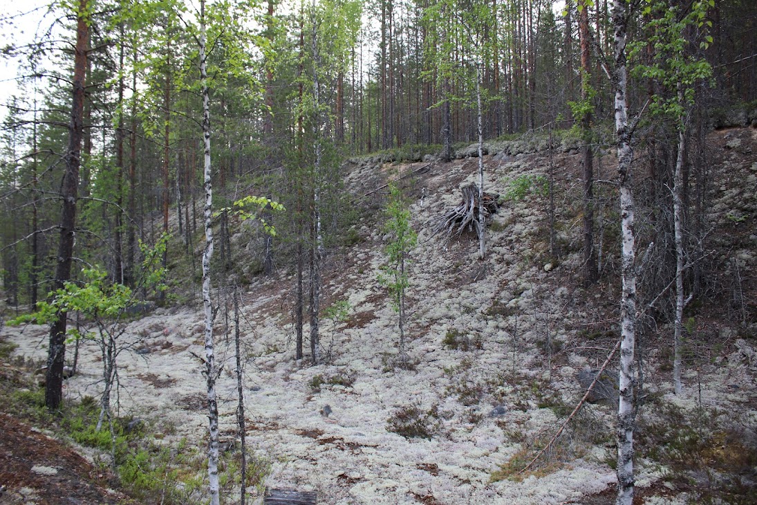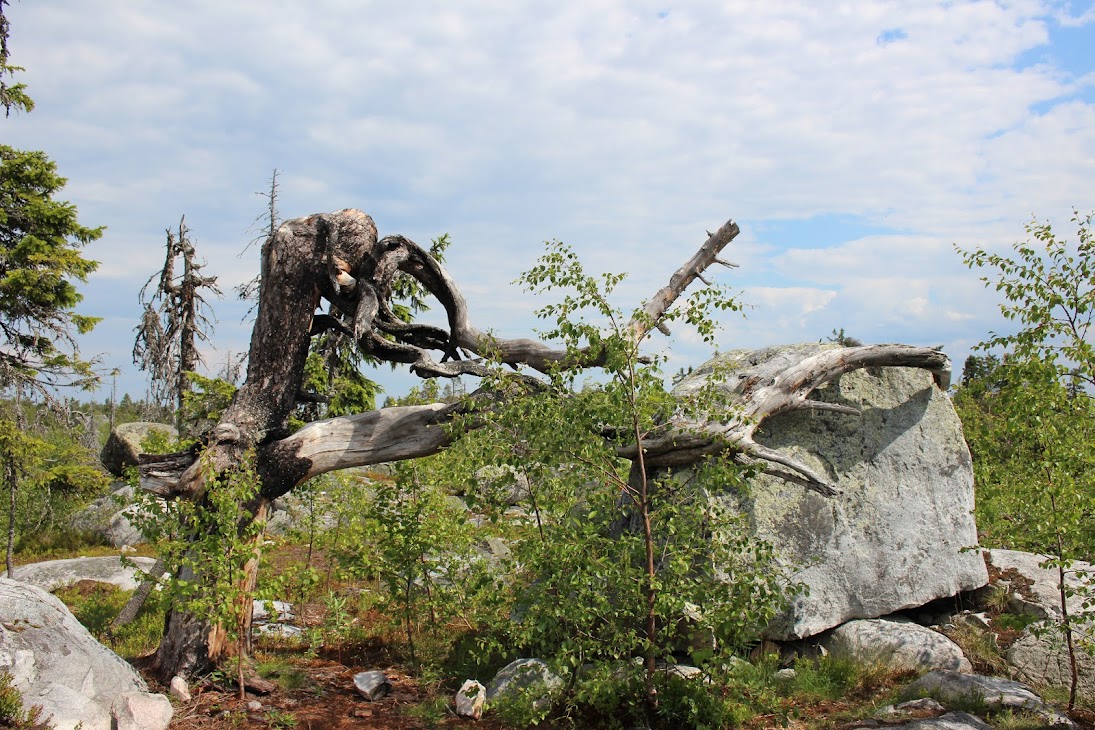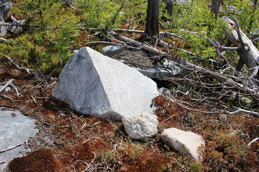 1) От юго-западного склона до озера. Здоровый лес на склоне переходит в сухие деревья. Много перекрученных деревьев. Много больших камней, много сейдов. Много бараньих лбов, обнажившихся скальных пород
