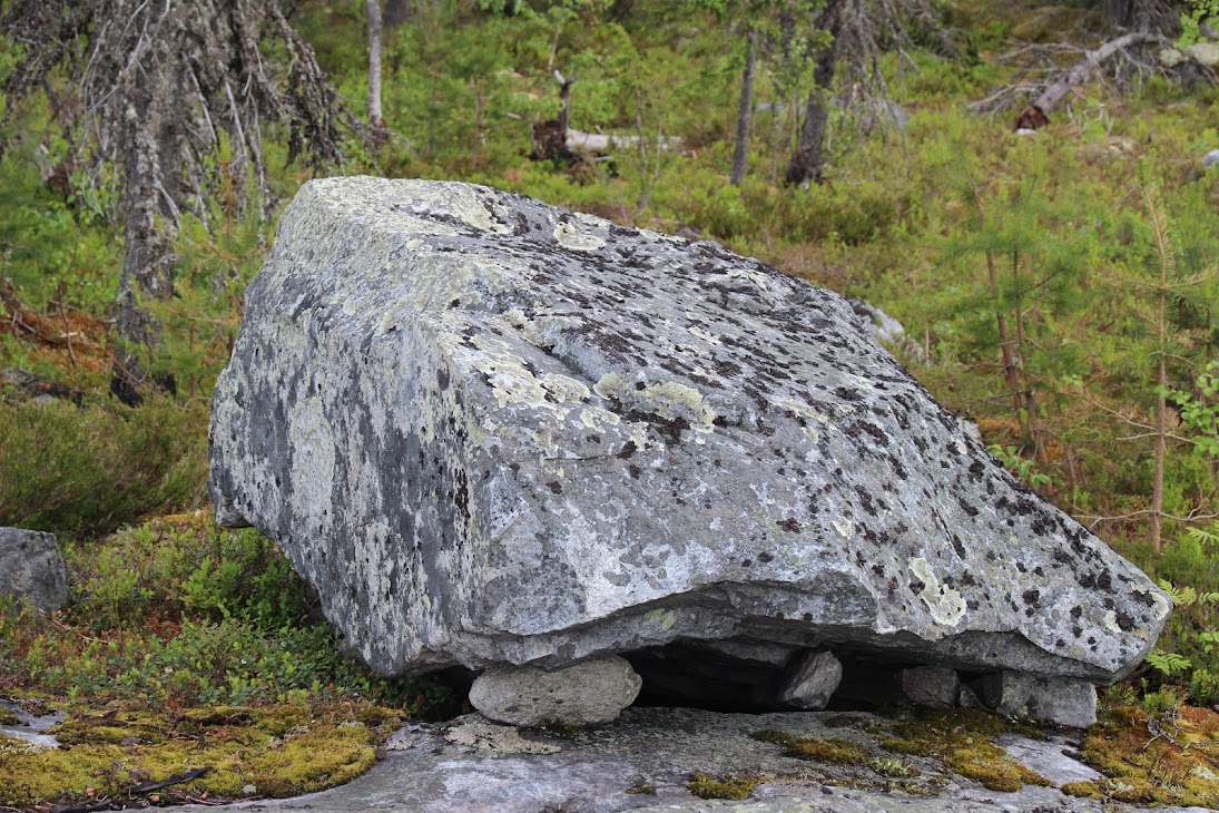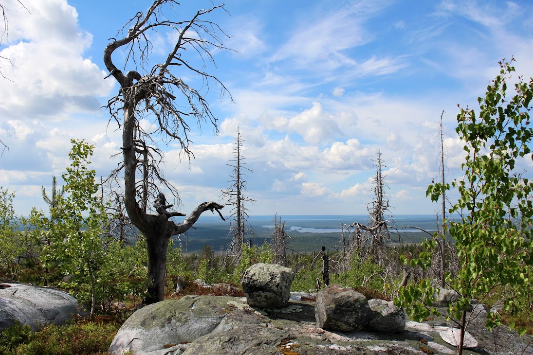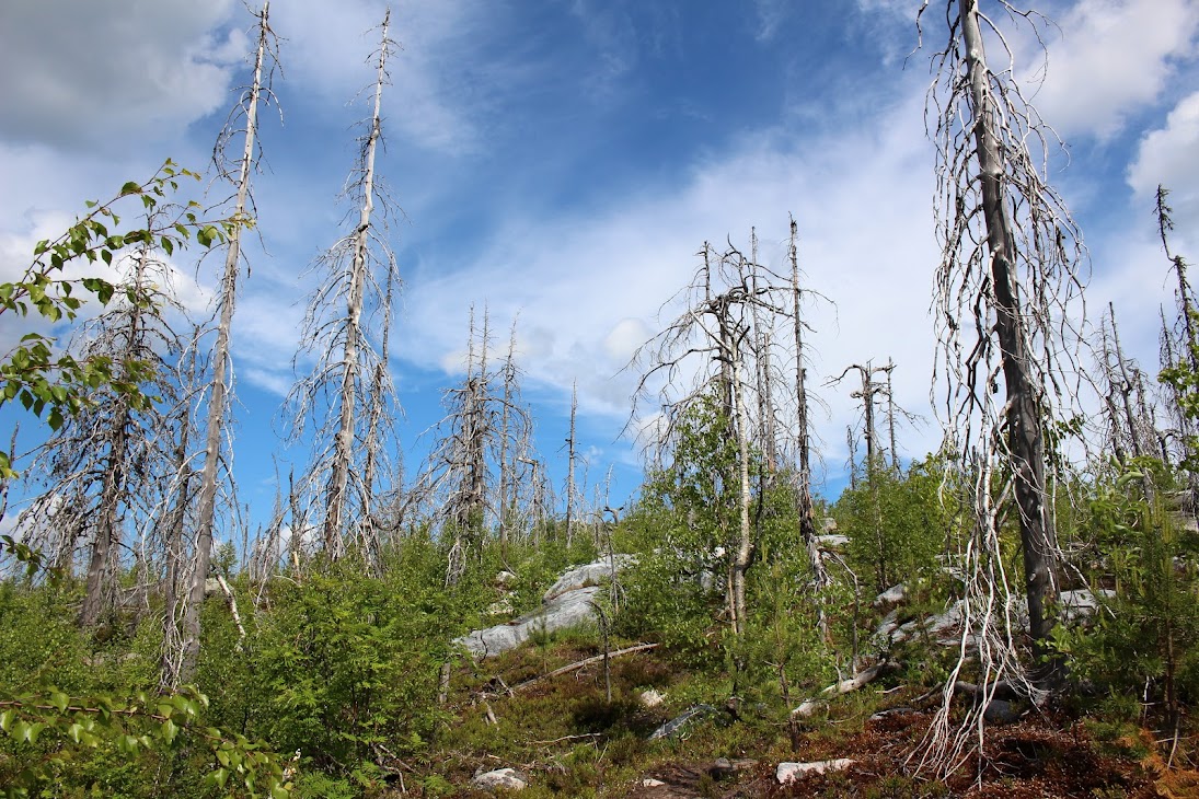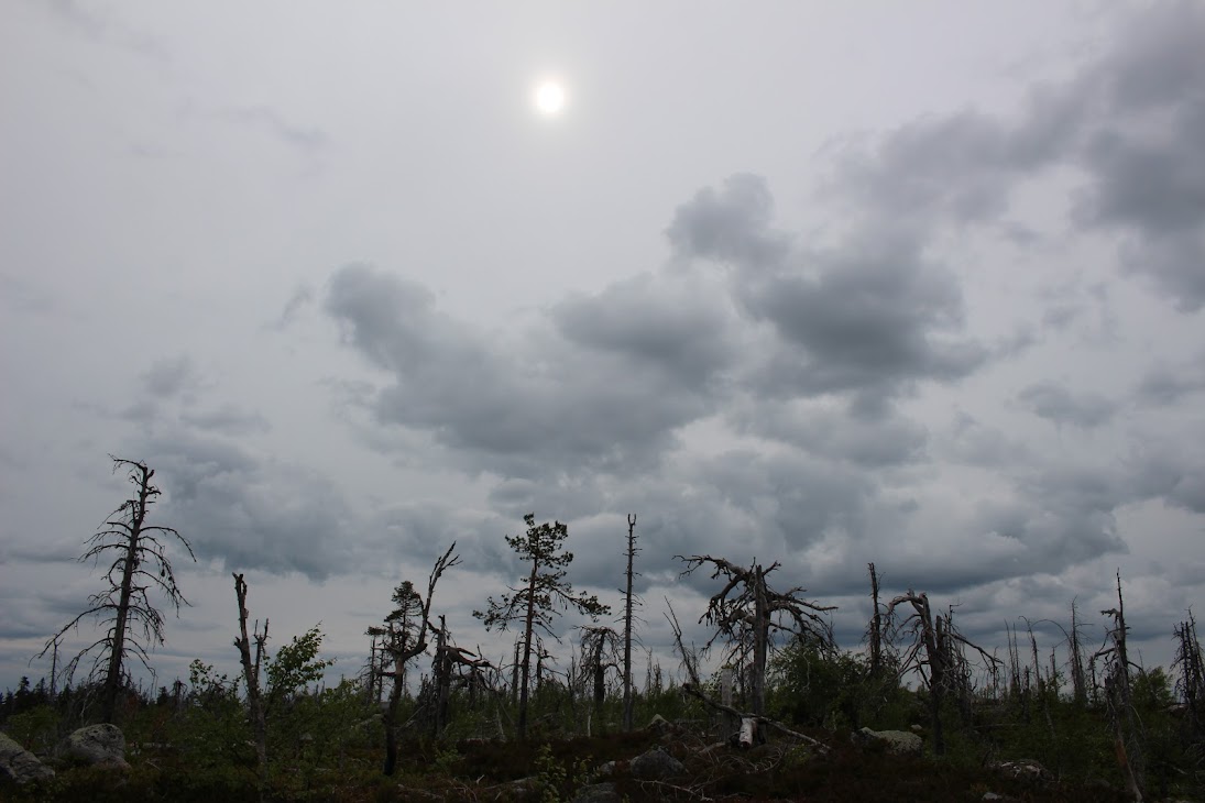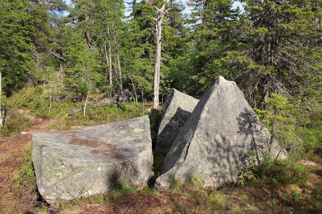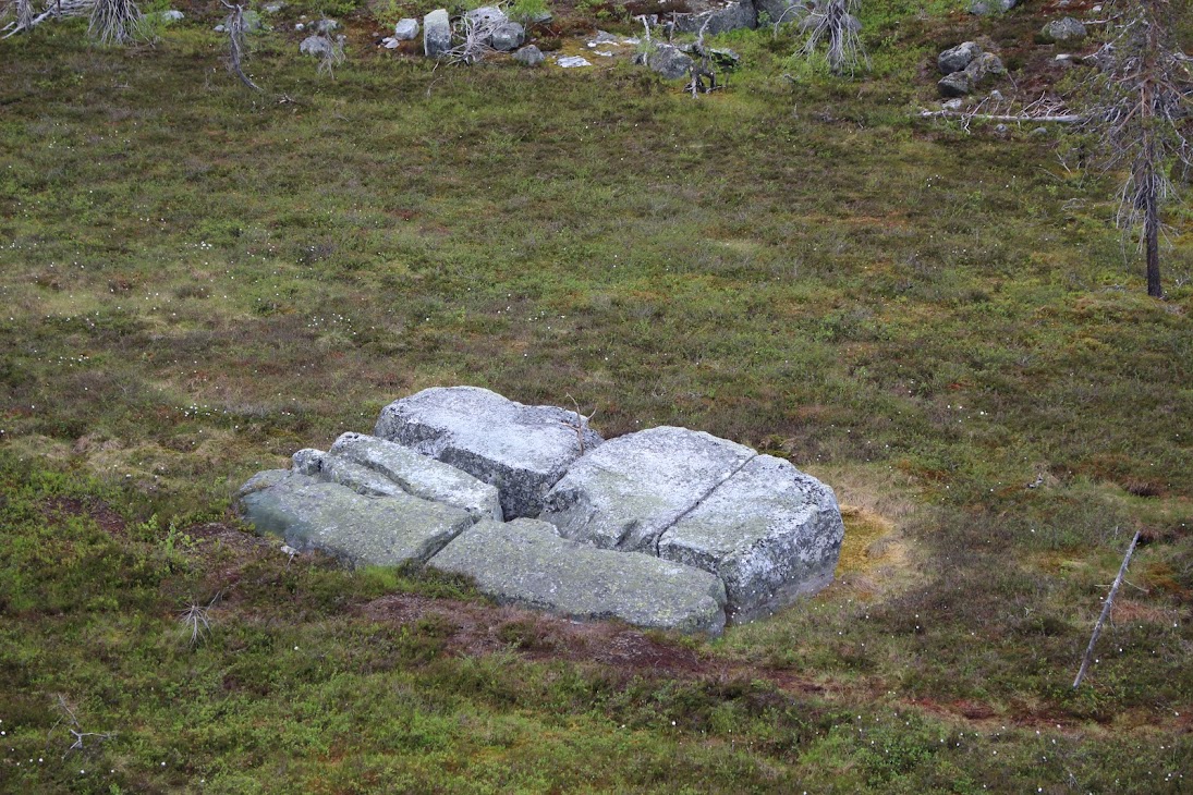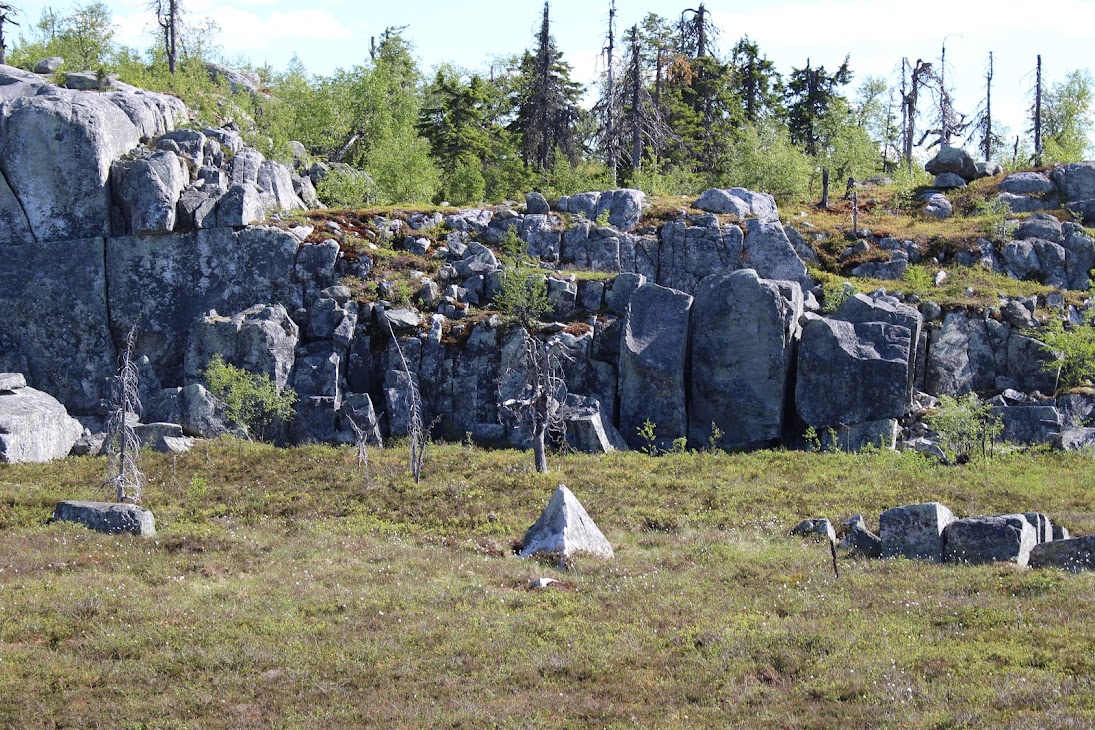 1) От юго-западного склона до озера. Здоровый лес на склоне переходит в сухие деревья. Много перекрученных деревьев. Много больших камней, много сейдов. Много бараньих лбов, обнажившихся скальных пород