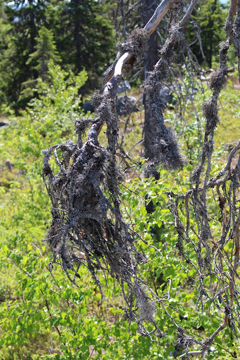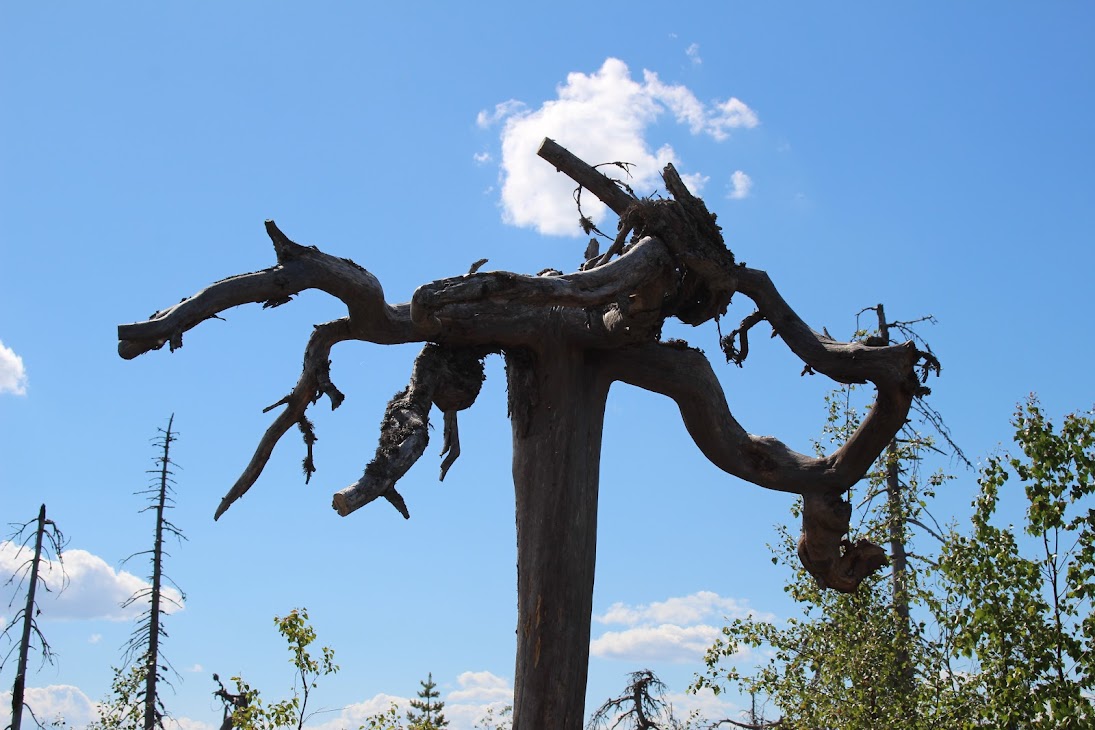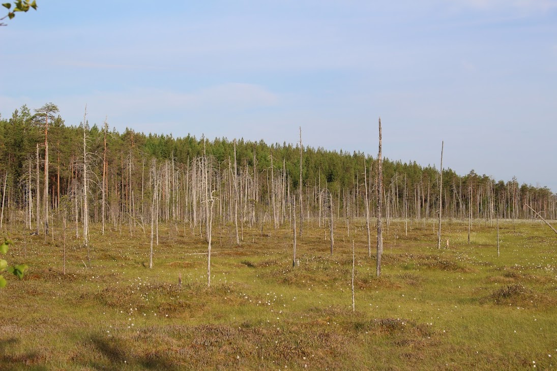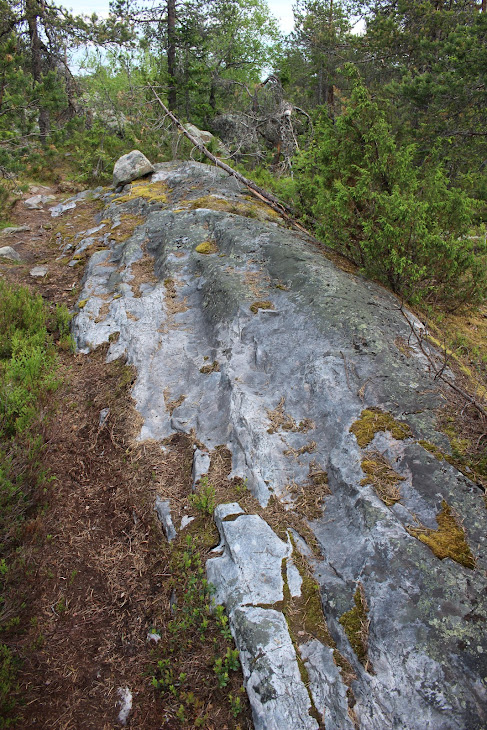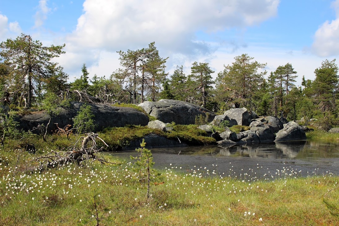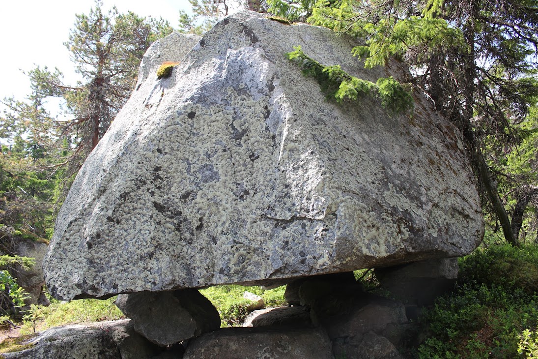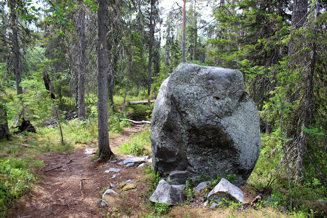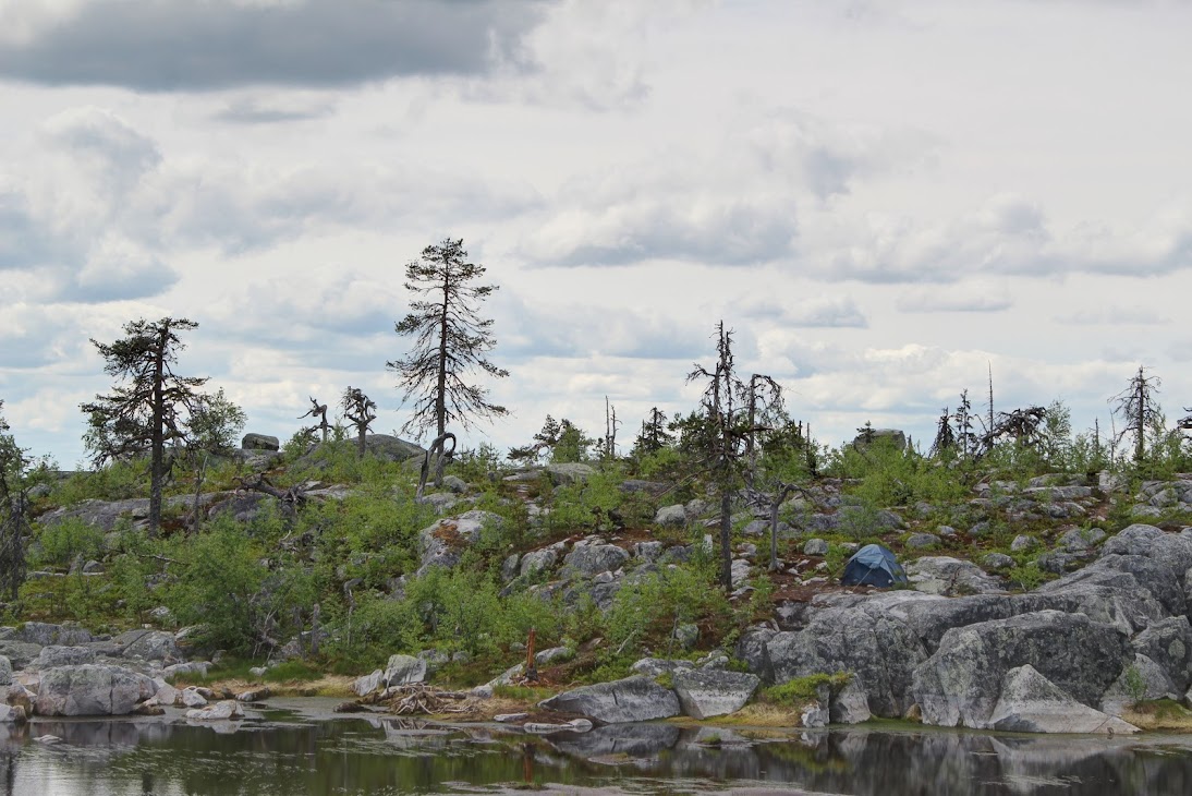 1) От юго-западного склона до озера. Здоровый лес на склоне переходит в сухие деревья. Много перекрученных деревьев. Много больших камней, много сейдов. Много бараньих лбов, обнажившихся скальных пород