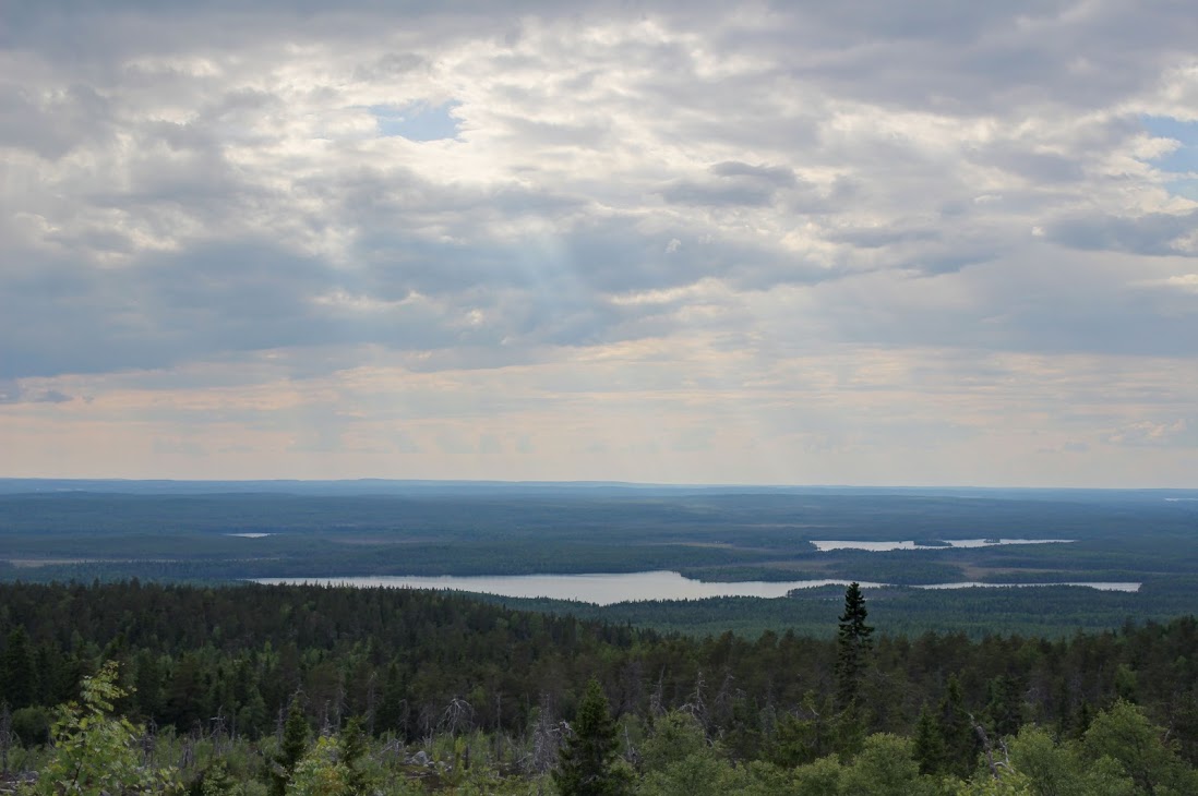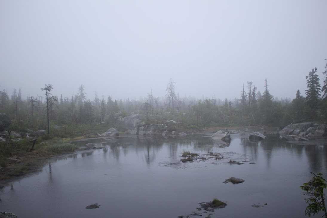 В общем, в 3 ночи поезд Санкт-Петербург-Костомукша прибыл на станцию Гимолы. Расписание поездов не очень удобное: поезда ходят дважды в неделю и можно либо вернуться в тот же день на обратном поезде, либо через 4 дня, либо только на следующей неделе. Небольшой поселок Гимолы расположен между озером Гимольское и бесчисленными болотами. Я недооценил особенности его расположения и, выпрыгнув из поезда в футболочке, был немедленно атакован стаей злых таежных комаров, отвязаться от которых удалось лишь только надев энцефалитку-скафандр. Идти в такой жарко, но на привалах по-другому невозможно.