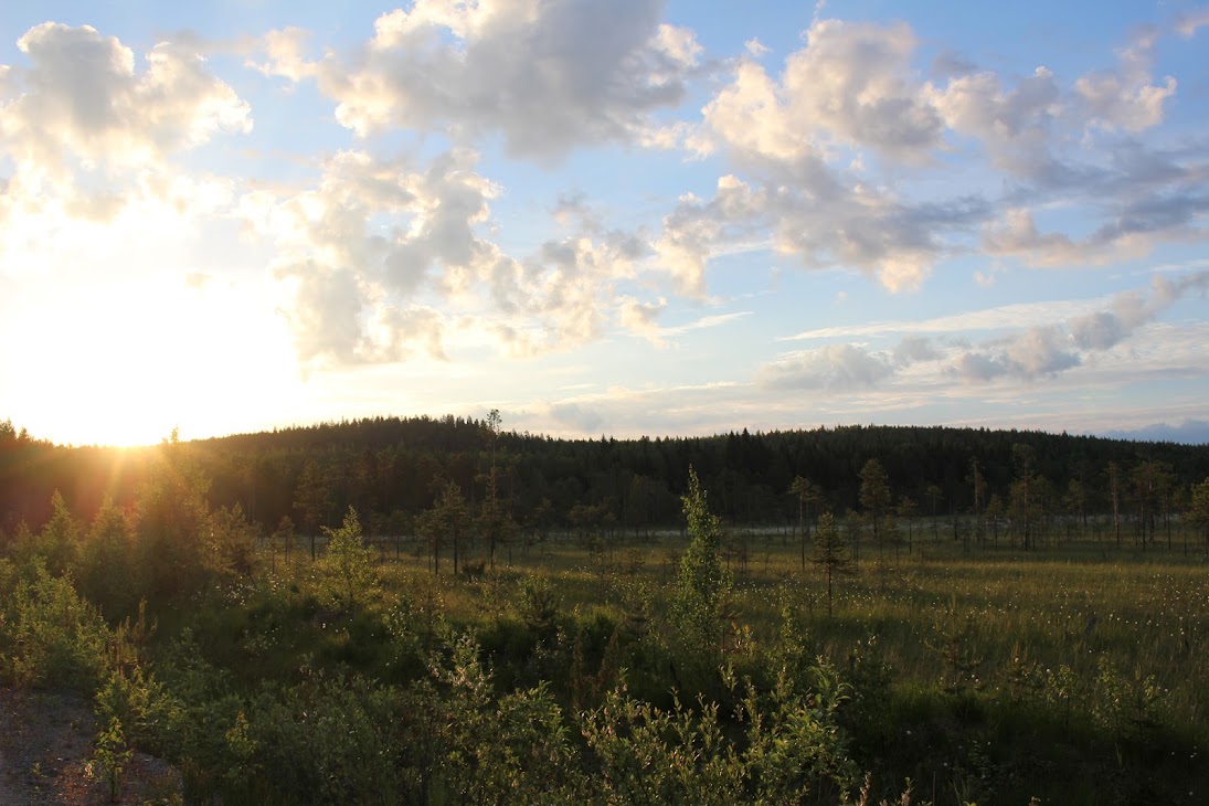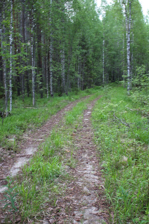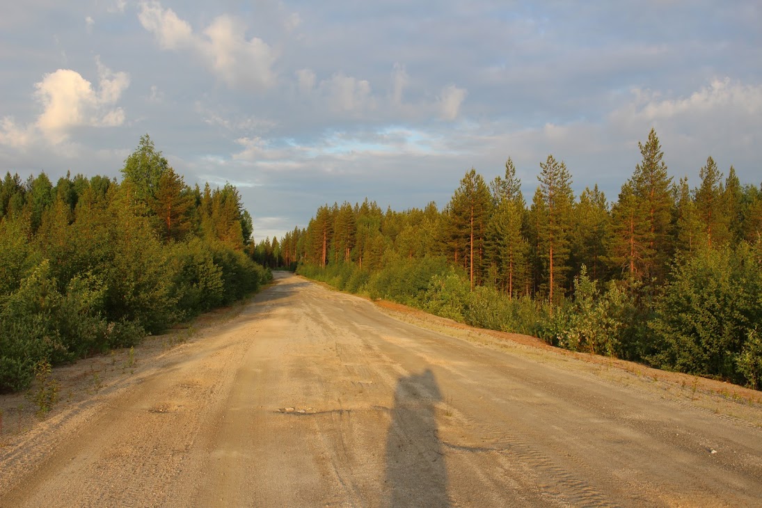 Сейчас белые ночи и в 3-4 утра солнце уже взошло и нехило печет. Если не считать жары и комаров, то идти одно удовольствие: белая ночь, тишина, пение птиц, чистейший воздух и запах трав. Поначалу трасса широченная, двухполосная, гравийная, но потом сужается и портится.