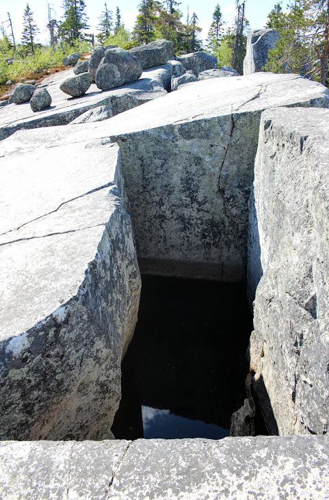 На западе от Головы проступают огромные каменные плиты. Встречаются расщелины. Местами расщелины заложены камнями. Как и в случае с сейдами непонятно, засунуты ли камни туда человеком или застряли естественным образом. Тут расположен еще один интересный объект, так называемый Колодец. Колодец интересен в первую очередь своей правильностью формы, на миг кажется, что блок вырезали и вынули. А вообще, вода собирается во многих местах под каменными плитами. Одни из отчаянных туристов даже собирались доставать воду оттуда.