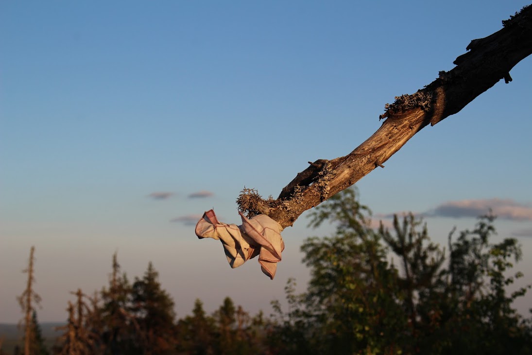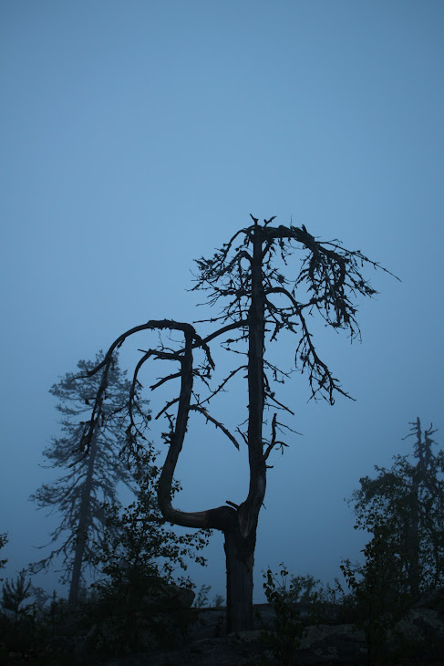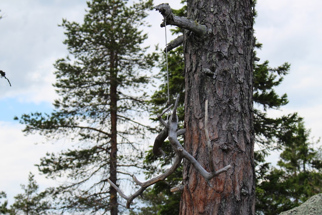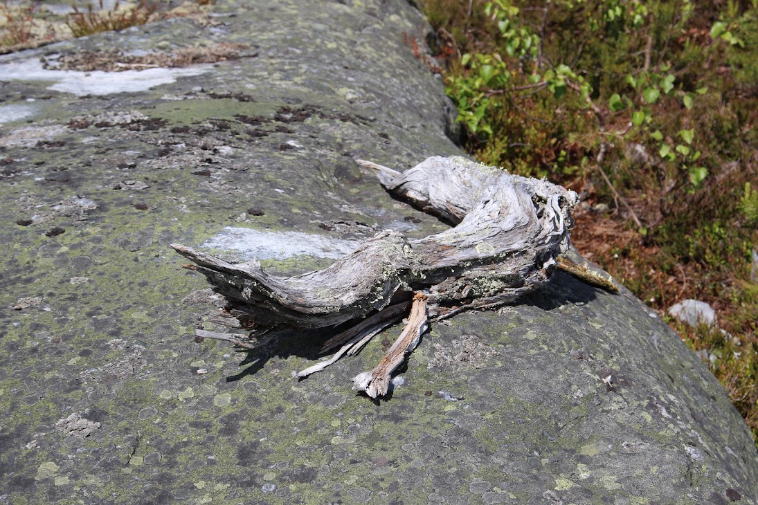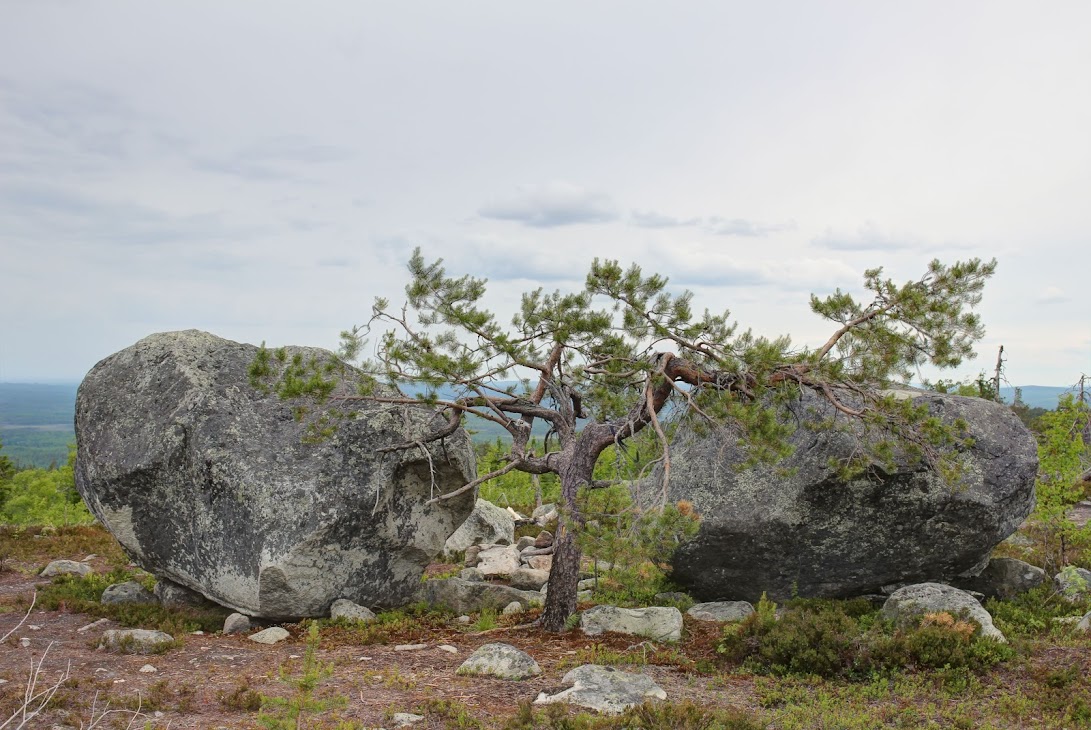 Интересно, но рядом с лестницей снова растет причудливо перекрученная сосна, одна на много километров вокруг. И место тут не особо ветреное, не такое, как на вершине горы. Что заставило меня снова задуматься о корреляции между сейдами (необычными камнями) и необычными деревьями.