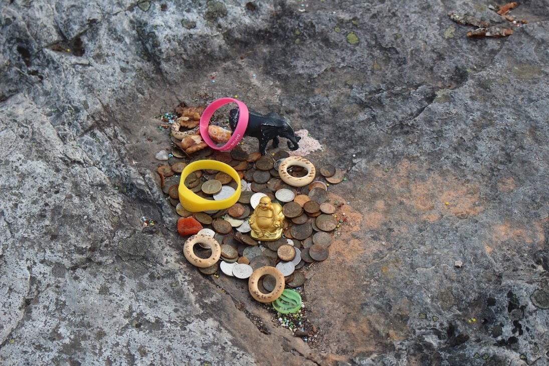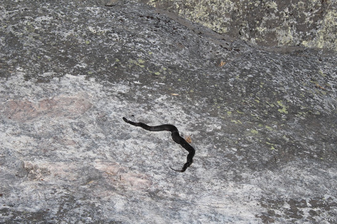 Стоянка щедро украшена всякими эзотерическими приблудами. Вообще, не лучшее место для лагеря: на открытом месте жарит солнце и продувают все ветра. На обнажившемся участке скалы сложно нормально поставить палатку. На камнях неподалеку греется змея (потом оказалось, что она мертвая). Проводники водят экскурсии к развалинам камней неподалеку и рассказывают заезженные истории про развалины храма и Гиперборею. Хорошо, хоть змею не видят, а то бы придумали, что это страж храма. Но меня достаточно вымотал марш-бросок с рюкзаком, а потом подъем на сопку по жаре, так что мне уже все равно.