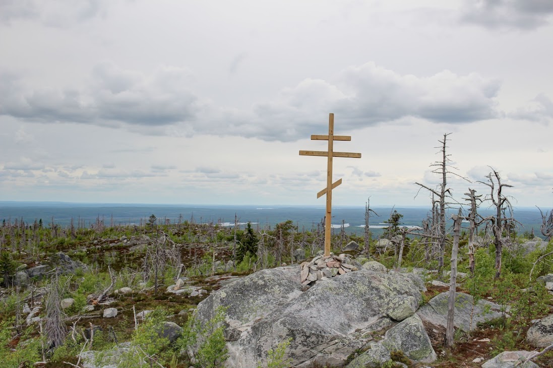 На противоположной стороне обрыва стоит деревянный крест